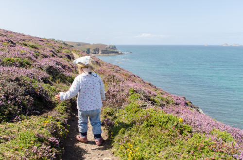 Weiter geht`s, über Feldwege, durch die kleinen Gassen von Kermeur und schließlich durch eine leuchtend rote Heidelandschaft, bis wir einen kleinen Parkplatz an der Küste erreichen. Wir genießen den Ausblick auf unser Ziel, die Pointe de Pen Hir.